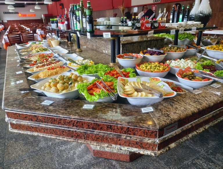 São 40 tipos de saladas (inclusos frutos do mar), comida japonesa e 12 tipos de pratos quentes.